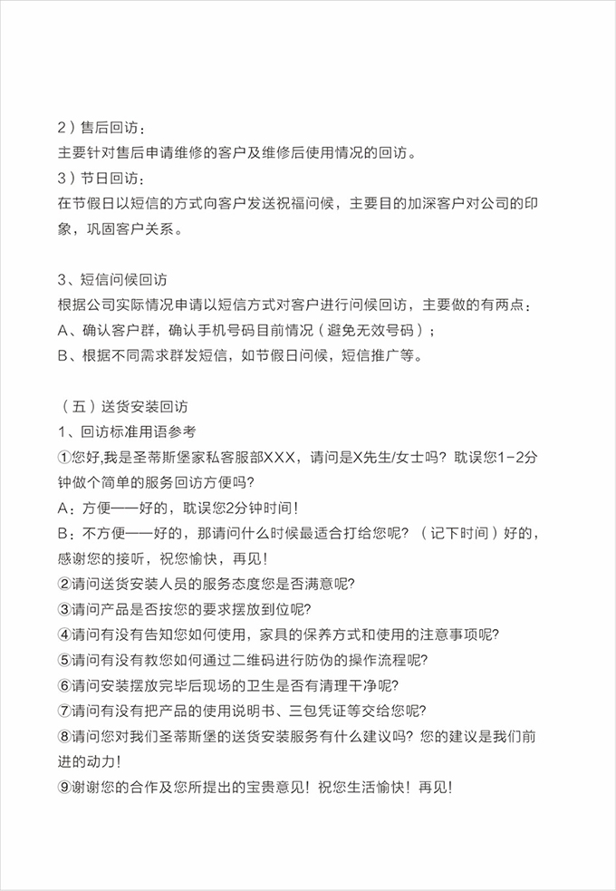話術參考:“**先生/女士您好,我是PA視訊的售后服務人員**,您購買的PA視訊家具已經全部到貨了,送貨安裝大約需要**時間,請問您這邊什么時候方便我們上門送貨安裝呢?”同時要了解送貨小區的電梯、樓道、入戶門的尺寸等,提前做好準備,避免意外情況。最后確定送貨時間(安裝所需要時長),并告知客戶安裝人員的相關信息,可加微信發送,并發送配送安裝流程說明。