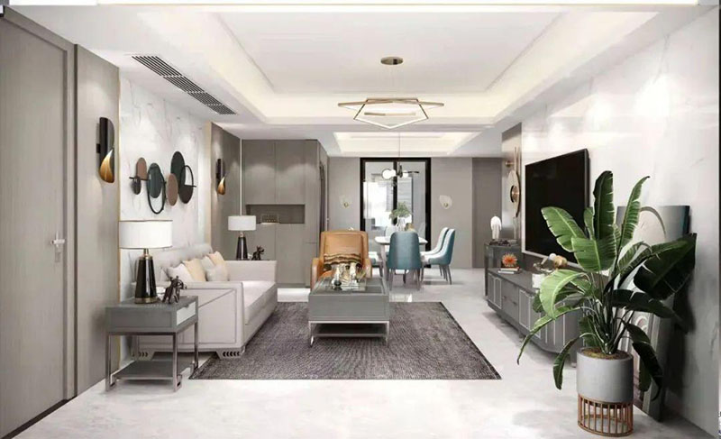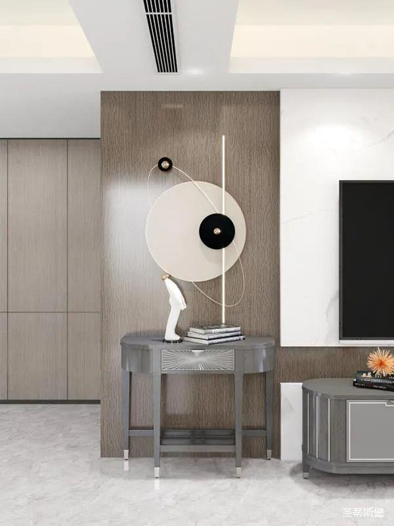 ▲設計師巧妙的運用填充藝術,將客廳電視與沙發背景色彩相呼應,利用凹凸互補的設計手法,傳遞著空間時尚。莫蘭迪實木家具,配以同色系的高級金屬底座,將精致輕奢從細節中脫穎而出。
