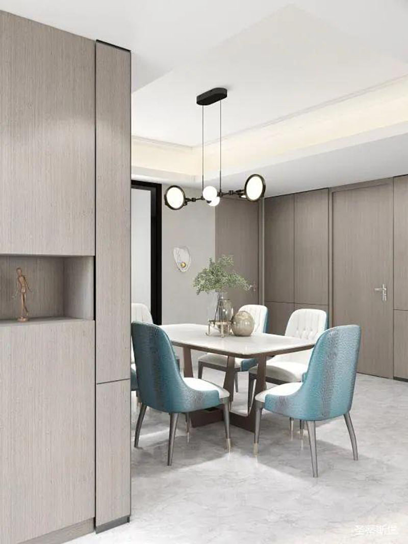 ▲澄亮湖藍的餐桌椅,一定是空間的點睛之處,溫柔跳脫的色彩,賦予了生活多姿多彩的體驗。經典黑的簡約燈飾,在不忘溫馨氛圍的同時,也引領著造型界的時尚潮流。