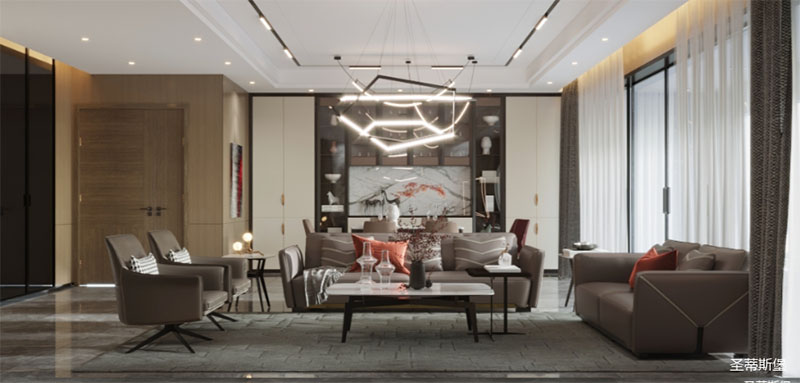 純美的線條,沉穩的色澤,為空間定下了低調而華麗的基調。渾然天成的實木與巖板紋理,讓角幾蕩漾出一幅“水光瀲滟”的潑墨油畫。三兩紅枝點綴,表達著“枝頭并蒂祝吉祥”的美好祝愿。光影透過極簡金屬幾腳,折射出一種隱藏的優雅氣質。大小、高低不一的天然材質角幾組合在一起,時尚又個性,不僅便于移動,還表現的靈活且輕巧。