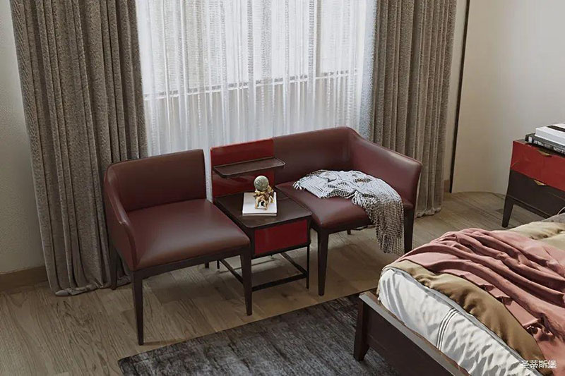 靈活變裝的主臥空間,自成獨特的設計語言與真摯的感情糅合。經典意式極簡軟床,流暢順滑的真皮床屏,賦予了空間溫馨高貴的氣息。酒紅實木質感的床頭柜,整齊擺放,欲有“鴻運當頭”的美好寓意,塑造出一方簡約知性的靈動空間。