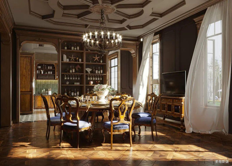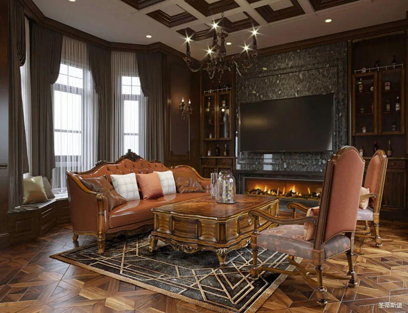 進(jìn)入客廳,純正美式城堡氣息撲面而來,大理石電視背景墻被實(shí)木對(duì)稱鑲嵌,兩側(cè)置頂實(shí)木酒架更添美式風(fēng)情。純正美式風(fēng)格沙發(fā),被流暢光滑的實(shí)木線條包圍,邊角之處盡顯柔美,真皮搭配全實(shí)木藝術(shù)雕刻,貼心的軟包設(shè)計(jì),讓脊椎盡情舒展。霸氣獸腳茶幾,將美式的粗獷大氣體現(xiàn)的淋漓盡致,精美絕倫的實(shí)木單椅在樸實(shí)自然的背景里顯得格外精致美好!