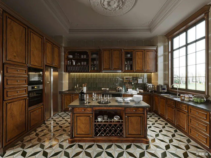 廚房為工字造型,櫥柜貼墻而立,廚具一應(yīng)俱全。家具造型典雅,又無過多繁雜裝飾,原木懷舊工藝,展現(xiàn)了美國早期開拓精神與崇高自然的原則。嵌入式電器在填補(bǔ)空間的同時(shí)也帶來了滿滿的金屬質(zhì)感。杯具隨意擺放,家人在廚房忙碌的身影隨即映入眼簾。
