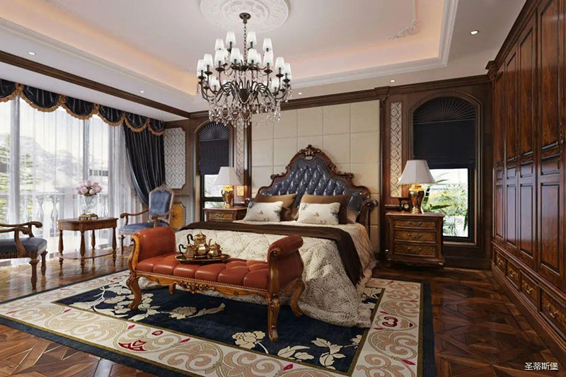 主臥置頂復(fù)古紋理的實(shí)木衣柜,在完善了收納的同時(shí),極簡動(dòng)線也完整了生活的風(fēng)貌。深海藍(lán)的高床屏與米色背景碰撞,猶如海水與沙灘相融,置身其中,仿佛與藍(lán)天碧海來了場(chǎng)浪漫自然的邂逅。地毯上精致的古典鮮花紋理,擷取設(shè)計(jì)師的絕妙巧思,與空間的雕花藝術(shù)相呼應(yīng),在居家空間里演繹了一場(chǎng)溫馨的藝術(shù)創(chuàng)作。