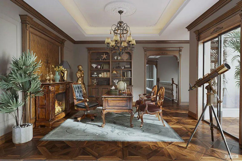 書房護(hù)墻板是由白楓木皮拼接的花鬘圖案,顏色層次分明,立體感超強(qiáng),營造了滿滿的美式鑲嵌藝術(shù)感。深沉木色邊柜在護(hù)墻板上延伸,逐漸浸染了古銅色的家具和燈飾,結(jié)合著拱形羅馬柱,塑造出端雅大方的環(huán)境氛圍。
