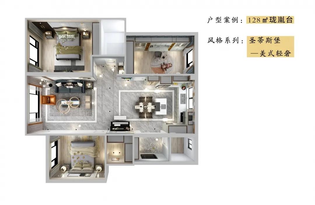 客廳延續(xù)著美式輕奢的氣韻,背景墻被簡約有序的金屬線條分割,營造出質(zhì)感空間的細膩。沙發(fā)沉穩(wěn)又不失時尚,色彩混搭更是讓人耳目一新,展現(xiàn)著美式風(fēng)格天性自由不羈的浪漫個性。
