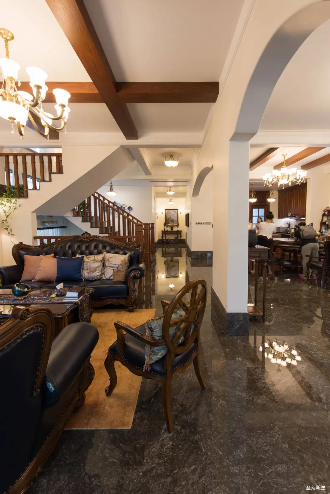 玄關進入轉角處,以穩重大氣實木為主色調的開放式中西餐廚空間,將一體化無隔斷設計貫徹到每個細節,采用了親膚真皮質感的餐椅,手工雕刻的曲線讓原本硬朗的空間變得格外優雅,自上而下,構成完整的美式空間氣度,在每天的生活點滴間,沉浸在美式風情中,更加隨性舒適。