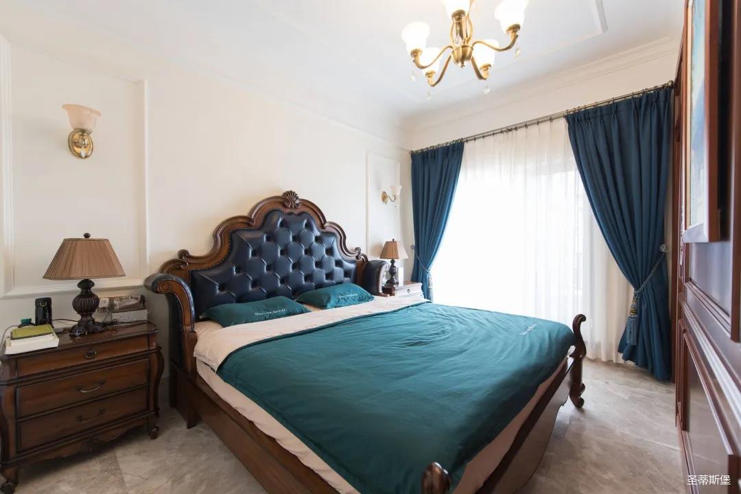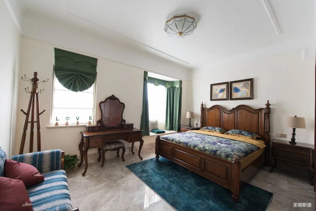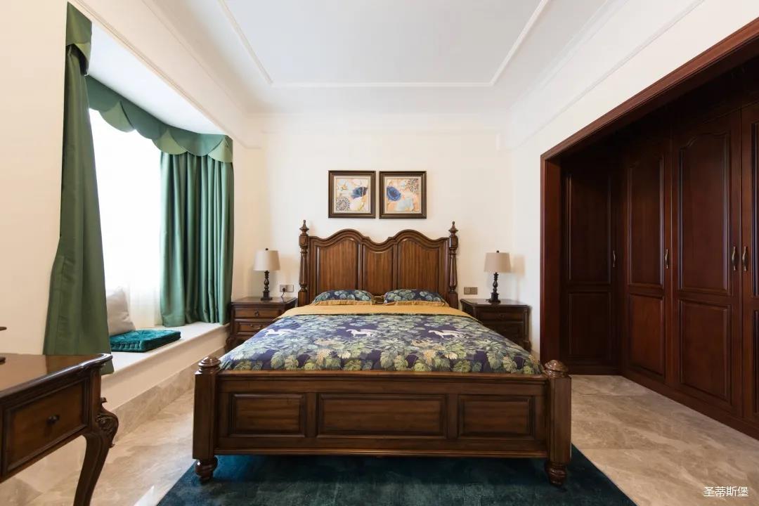 三樓是兩間臥房,每一間臥室都有自己的特定屬性。主人房端莊優雅,雍容盡顯;墻面以簡潔的美式石膏線修飾,波浪形的實木床屏上點綴著太陽形狀的手工雕花,宛如海平面上剛出升的太陽,讓整個空間色彩奔放。