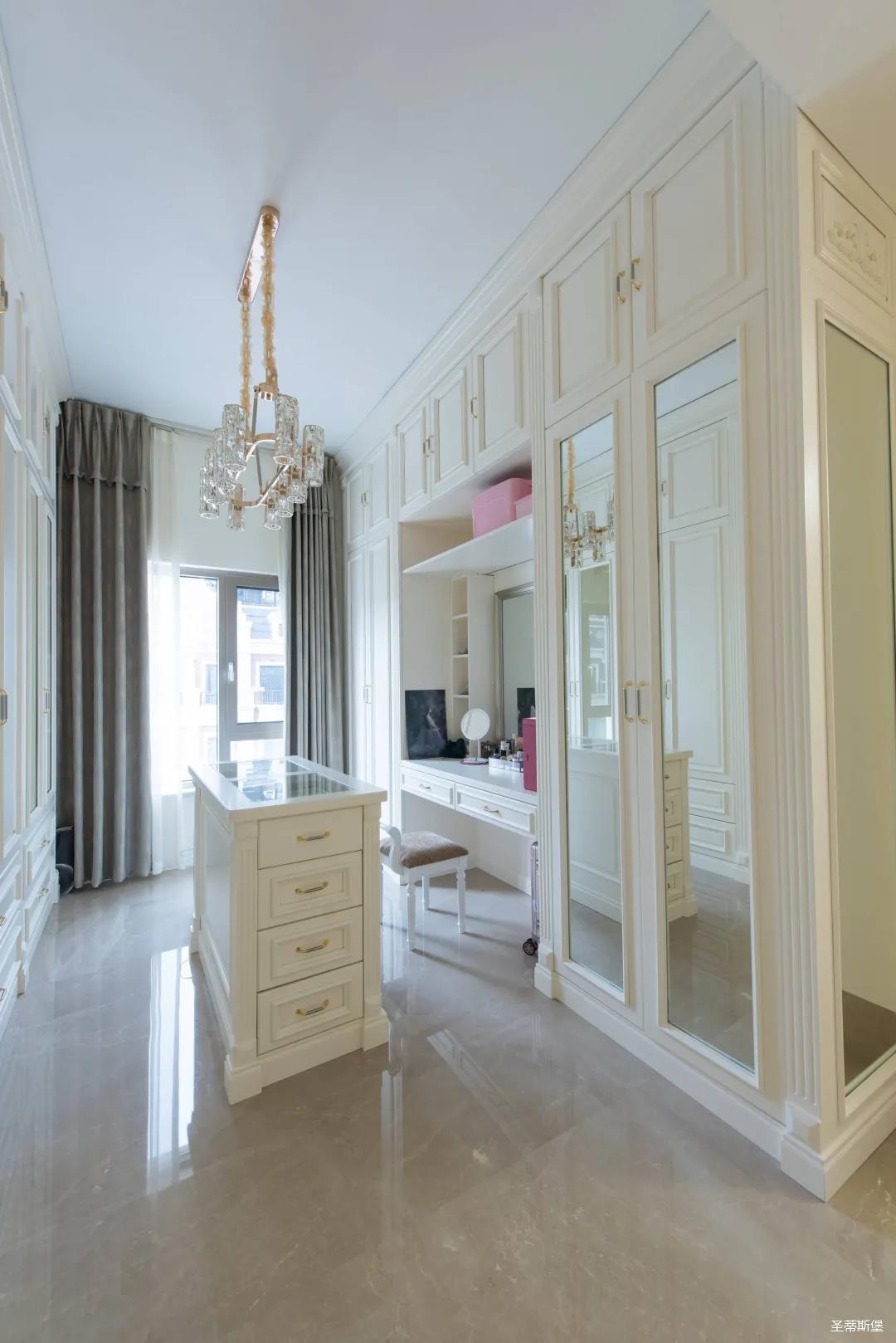 經過房間玄關過道,一眼就被這夢幻的景象給征服,摒棄繁雜,少許的金色元素點綴,予以空間輕奢細膩的質感,卻又不失美式韻味。