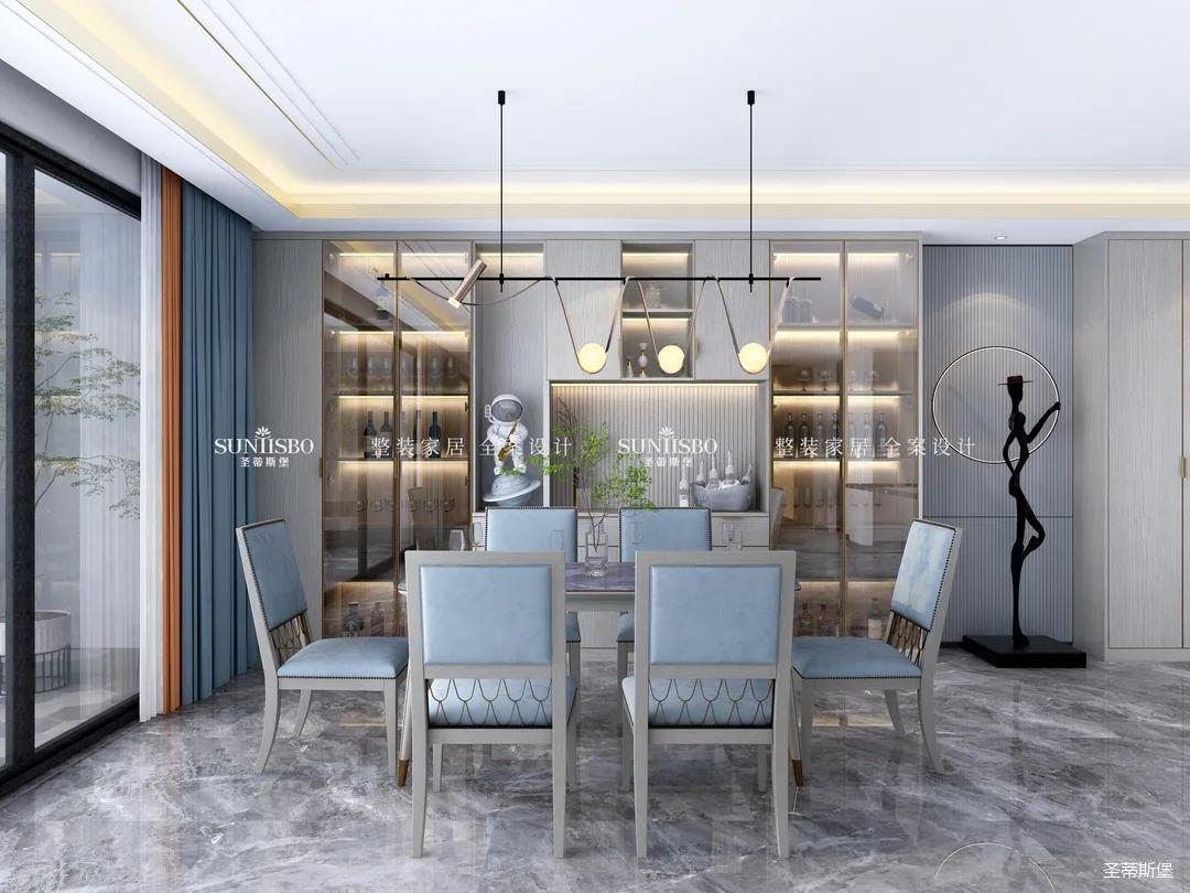 從優(yōu)雅中款款而來,高級灰與霧霾藍的冷靜色調勾勒出一個高貴而又摩登的用餐空間。設計師從玄關直入打造一排定制柜體,包含了玄關和餐邊柜,藝術燈形與時尚餐椅弧形相呼應,營造出溫暖柔和的用餐環(huán)境。