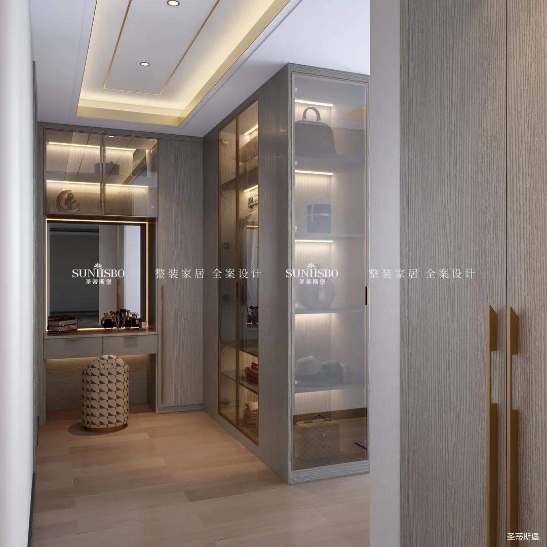 半開放式衣帽間分隔了主臥與梳妝兩個獨立空間,金色是詮釋華貴最直接的表達,將金屬鑲嵌于玻璃材質與實木之間,令空間光芒透射加倍。