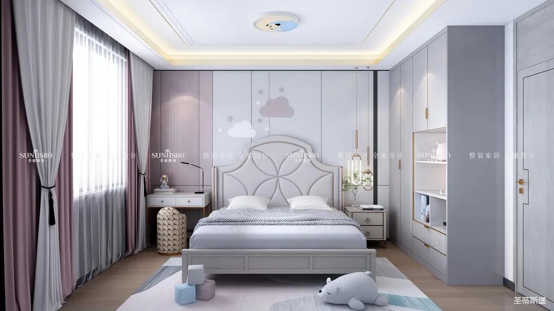 兒童房以粉白為基調,醞釀著世間充滿童真和浪漫的語言。四照花型的床屏,讓人聯(lián)想到被粉色鮮花包圍的公主王國。封閉式的收納衣柜增加了開放式的兒童玩偶展示區(qū),溫馨又浪漫,讓小孩在童話王國里長大。