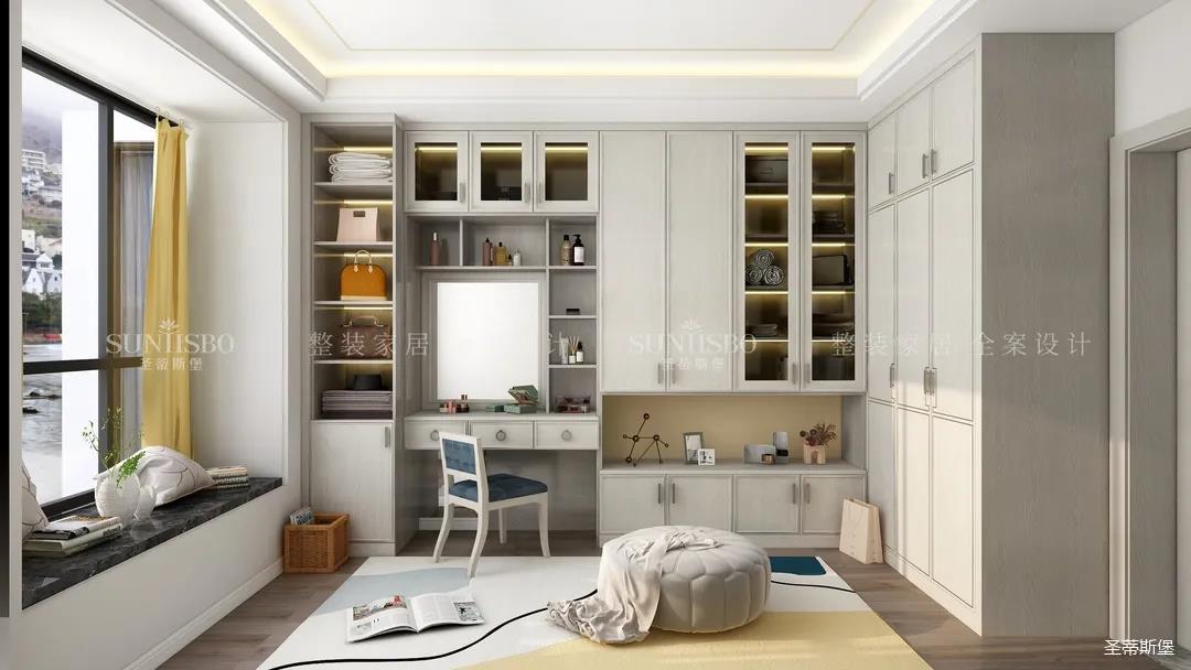 衣帽間是女主特別要求的,設計是將房間打造成衣帽間系統,采用L型布局,壁掛式設計,讓穿搭動線更順暢,視覺上也更通透,可直觀的展示女主人穿搭品味。玻璃層板與背板花色的結合,精致靈動,成為時尚與輕奢的寫照,封閉區衣柜的合理格局規劃,完美詮釋現代輕奢風于當代定制中的前瞻性。
