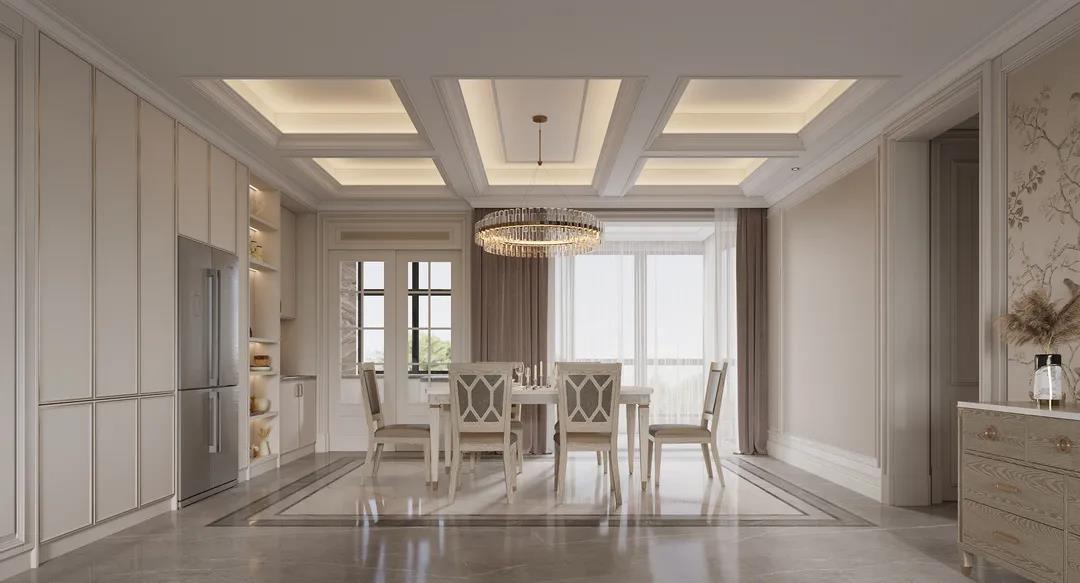 美輪美奐的天花吊頂,巧奪天工的護(hù)墻線雕,硬朗的美式線條和明亮金屬的輕奢質(zhì)感,均展現(xiàn)著高雅與浪漫的生活腔調(diào)。