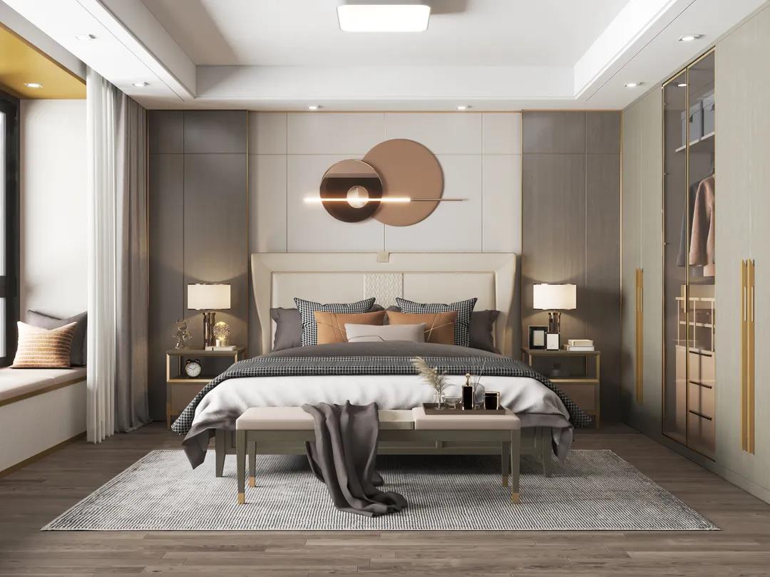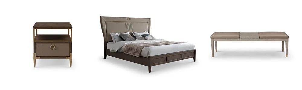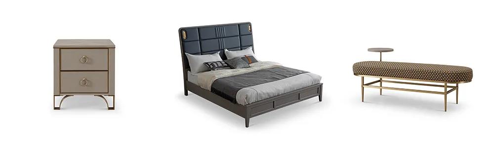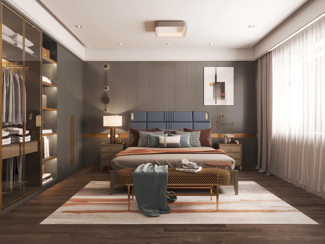 床屏時尚的霧霾藍色,與素雅的床品營造出一種低調的簡奢氛圍。金屬點綴著柜體拉手,床尾凳、床頭柜等微小細節,讓生活充滿著內在涵養與力量。