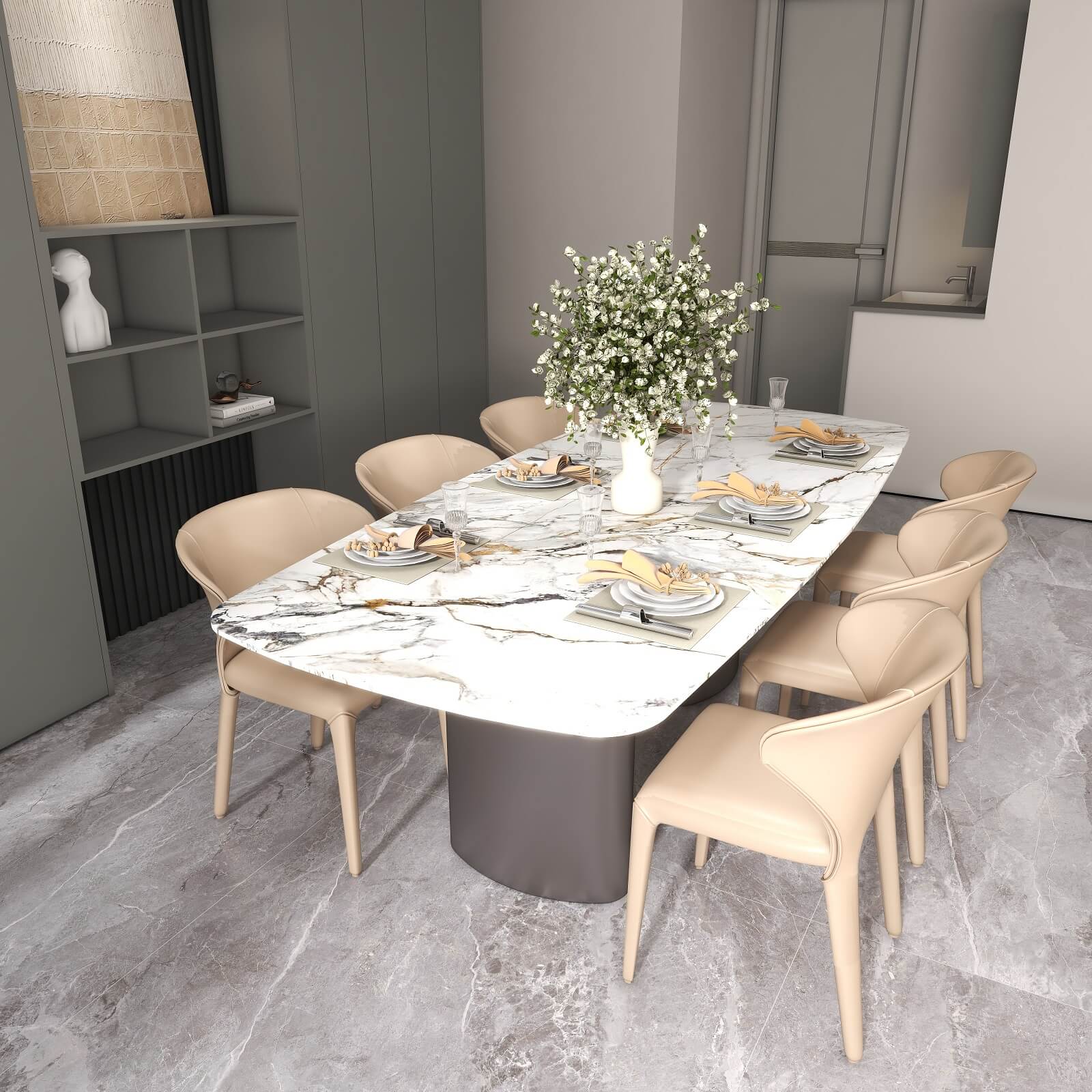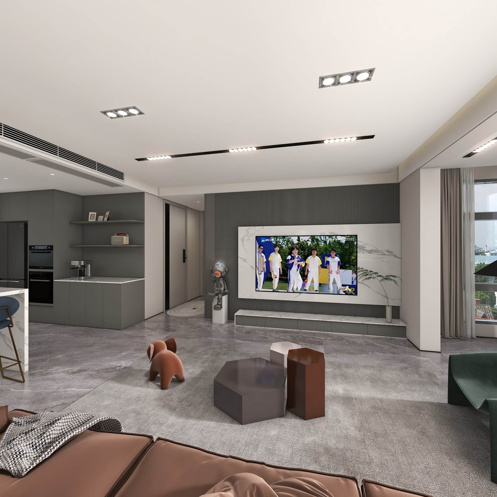 光影流動,木飾面、大理石、木格柵交織出不同層次秩序,給予空間精致質(zhì)感。
