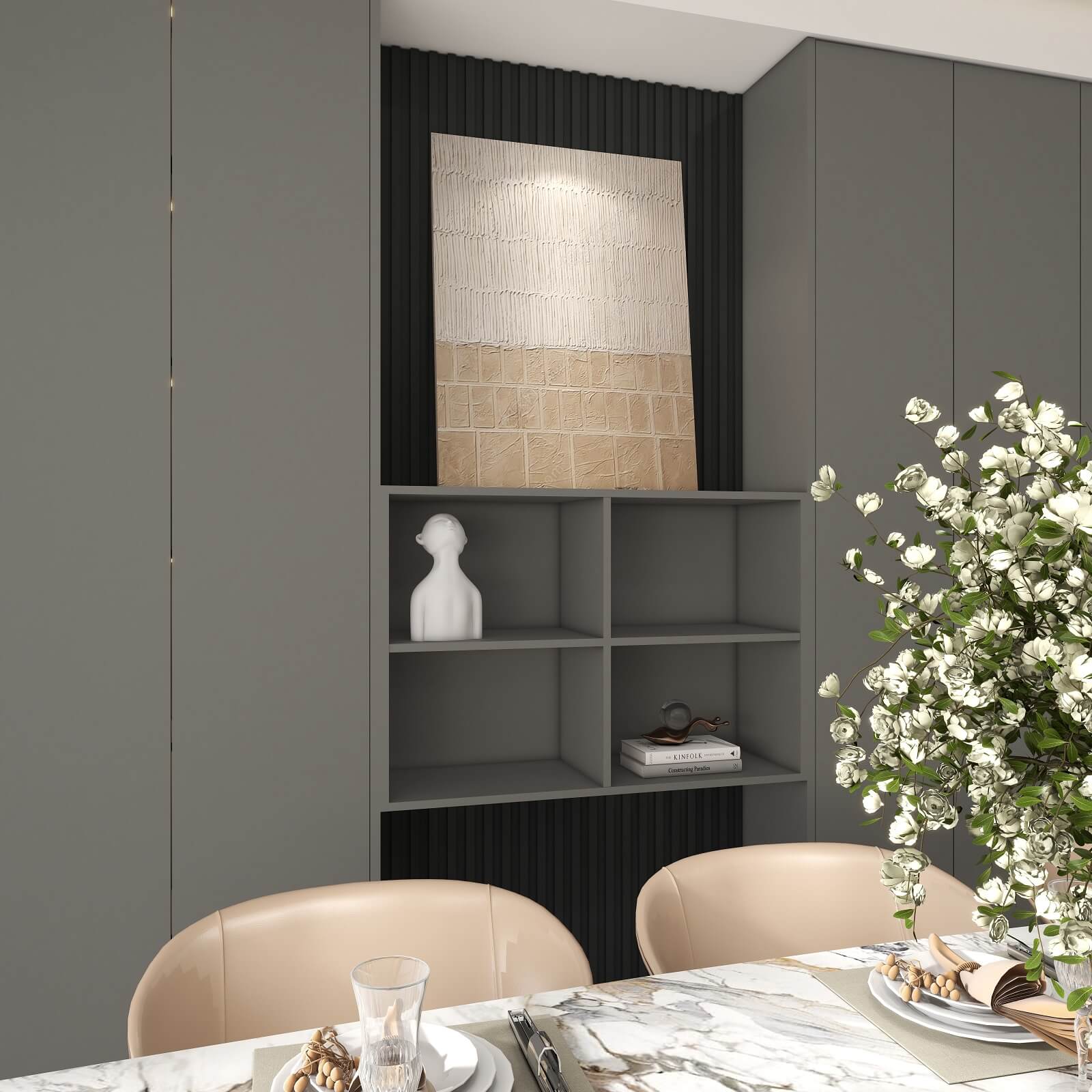 大面積運(yùn)用深灰色,格柵元素極具設(shè)計感,在層板燈的渲染下整個玄關(guān)輕奢有內(nèi)涵,給空間增添了幾分自然純粹的氣息,讓人身心放松。