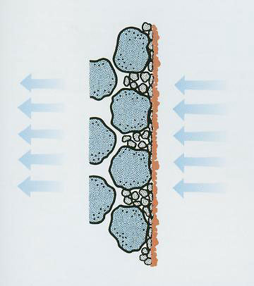 在塑燒濾板的母體基板內部,經過對時間、溫度的控制燒結后,會形成均勻孔隙。然后由樹脂填充表面處理,使孔隙達到均勻的u級微孔。獨特的表面處理不僅只限于濾板表面,而是深入到孔隙內部。見圖一。
