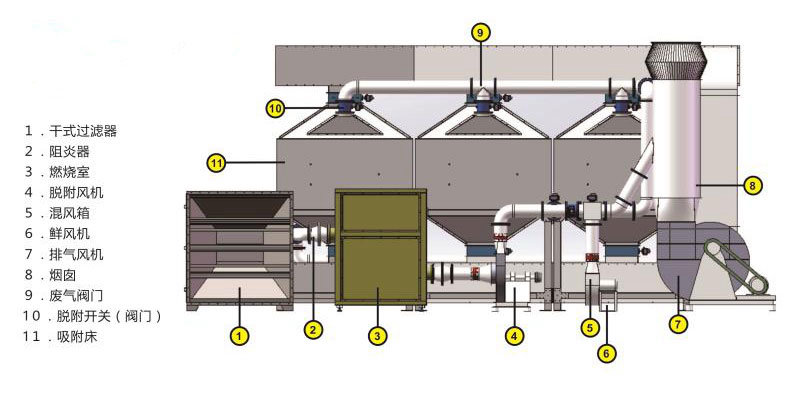 采用 “固定床吸附+RCO催化氧化設(shè)備”,其優(yōu)點(diǎn)為可靠、處理效率高,同時(shí),不會(huì)產(chǎn)生二次污染,不會(huì)像其它處理方式如顆粒炭易發(fā)生自燃現(xiàn)象等,做到真正的節(jié)能、環(huán)保。采用系統(tǒng)自動(dòng)脫附、增加蓄熱體、盡可能降低運(yùn)行成本。