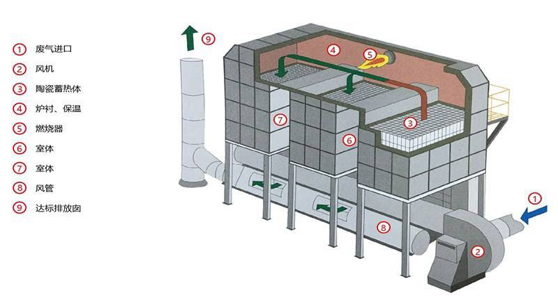 RTO廢氣處理設備原理是把有機廢氣加熱到760攝氏度(具體需要看成分)以上,使廢氣中的VOC氧化分解成二氧化碳和水。氧化產生的高溫氣體流經特制的陶瓷蓄熱體,使陶瓷體升溫而“蓄熱”,此“蓄熱”用于預熱后續(xù)進入的有機廢氣。從而節(jié)省廢氣升溫的燃料消耗。陶瓷蓄熱室應分成兩個(含兩個)以上,每個蓄熱室依次經歷蓄熱-放熱-清掃等程序,周而復始,連續(xù)工作。蓄熱室“放熱”后應立即引入適量潔凈空氣對該蓄熱室進行清掃(以保證VOC去除率在百分之98以上),只有待清掃完成后才能進入“蓄熱”程序。否則殘留的VOCS隨煙氣排放到煙囪從而降低處理效率。