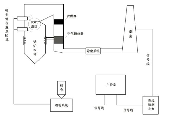 此工藝采用的脫硝劑為高分子活性物窯爐煙氣脫硝劑,并以其“投資少,效果好,安裝簡(jiǎn)單,運(yùn)行成本低”等特點(diǎn)被迅速推廣應(yīng)用。該技術(shù)是采用粉體輸送設(shè)備將其——高分子活性物脫硝劑噴入爐膛或者煙道溫度在850℃的溫度區(qū)域,被高溫氣化后,與煙氣中的NOx化學(xué)反應(yīng),還原成N2/H2O和硝酸鹽顆粒物。同時(shí)可根據(jù)企業(yè)煙氣排口安裝的連續(xù)在線監(jiān)測(cè)系統(tǒng),監(jiān)測(cè)出的數(shù)據(jù)和企業(yè)的排放指標(biāo),采用PID自動(dòng)控制系統(tǒng)控制試劑用量大小,達(dá)到脫硝的目的。